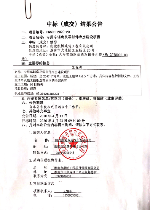 專用車輔房及零部件庫房建設(shè)項(xiàng)目中標(biāo)(成交)結(jié)果公告發(fā)布時(shí)間:2020.04.23 已閱 次 [大] [中]